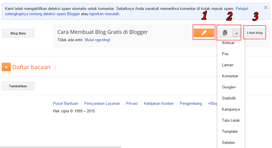 2. Navigasi Dashboard Blogger: Pengaturan menu blogger, berikut penjelasannya: