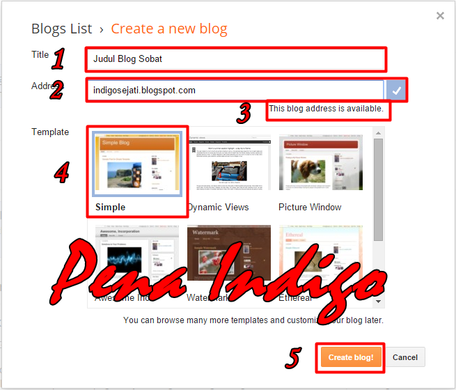 - This blog address is available: Alamat blog tersedia (jika alamat blog tidak tersedia silahkan ulangi dengan nama blog lain sampai tersedia).